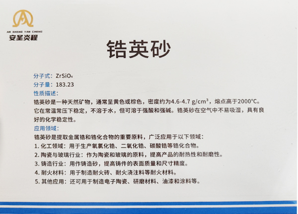 锆英砂亦称锆英石,是一种以锆的硅酸盐为主要组成的矿物。纯净的锆英砂为无色透明晶体,常因产地不同、含杂质的种类与数量不同而染成黄、橙、红、褐等色,结晶构造属四方晶系,呈四方锥柱形,比重4.6~4.71,均匀莫氏硬度为7~8级,折射率1.93-2.01,熔点随所含杂质的不同在2190~2420℃内波动。
